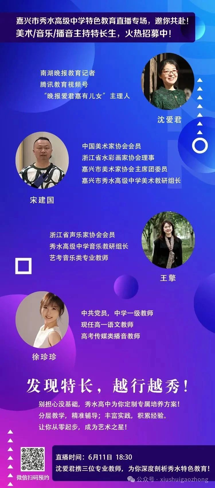 2025年6月11日18:30,鎖定嘉興市秀水高級(jí)中學(xué)特色教育直播專場。在直播中,你將深入了解美術(shù)、音樂、播音主持招生要求、培養(yǎng)目標(biāo)、課程設(shè)置等詳細(xì)信息,還能與嘉賓們進(jìn)行實(shí)時(shí)互動(dòng),提出你的疑問和困惑,獲得專業(yè)的解答和建議。