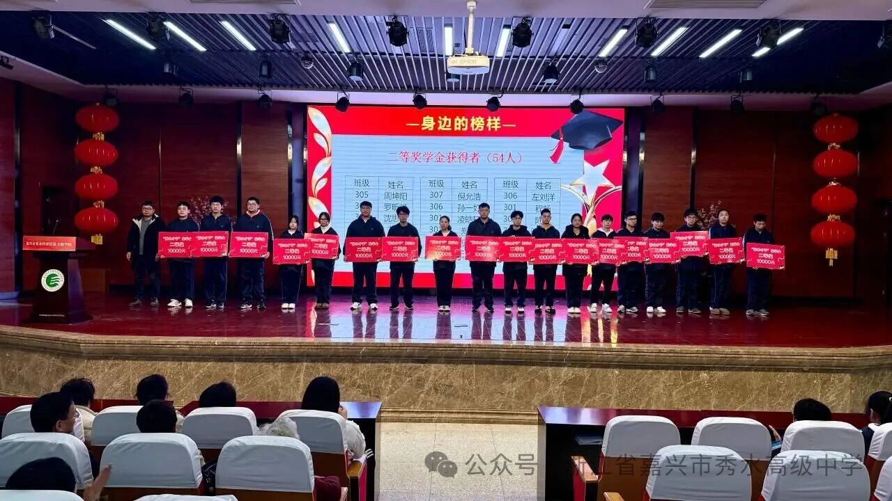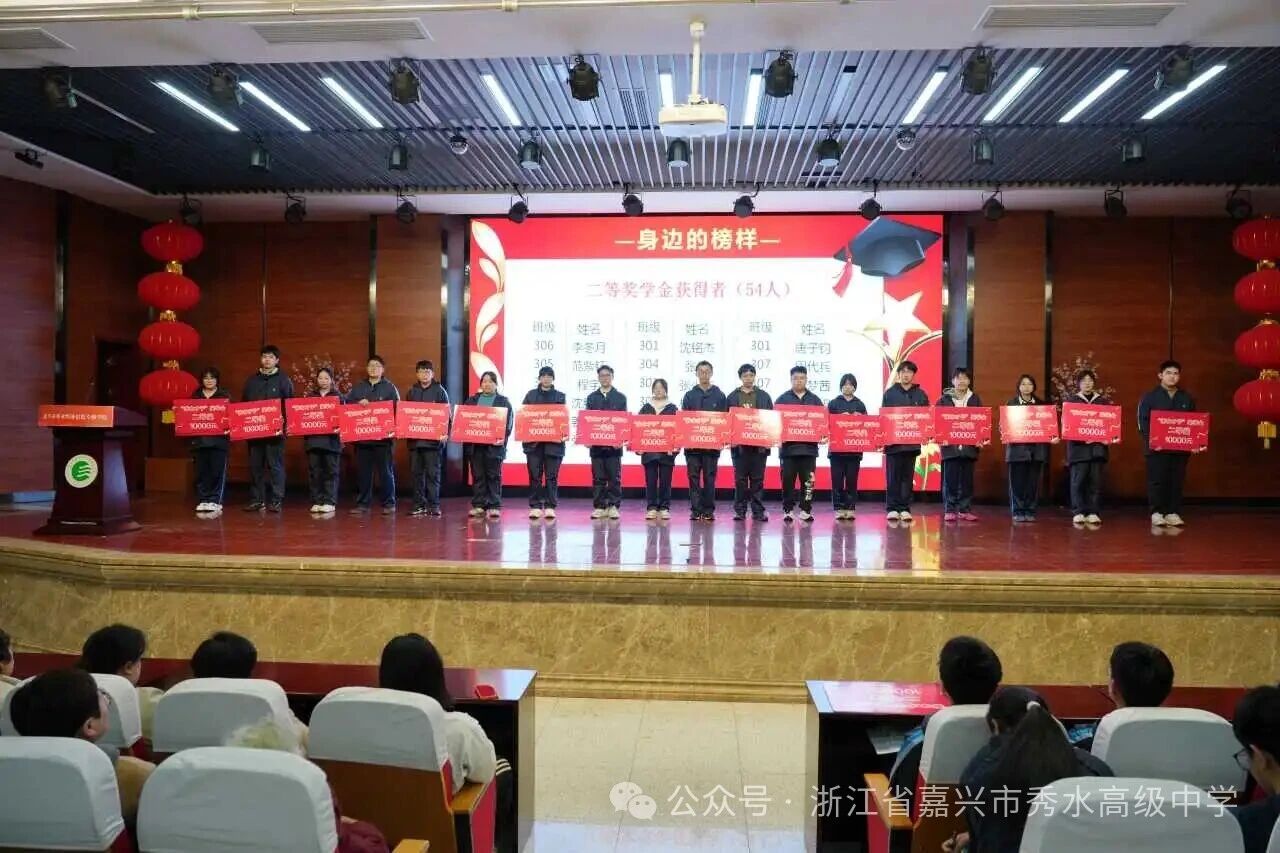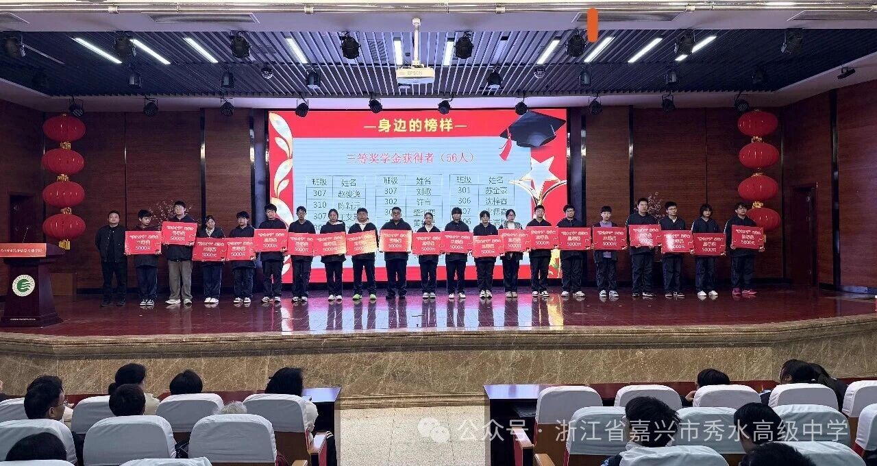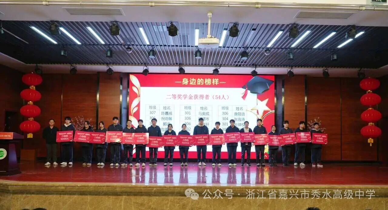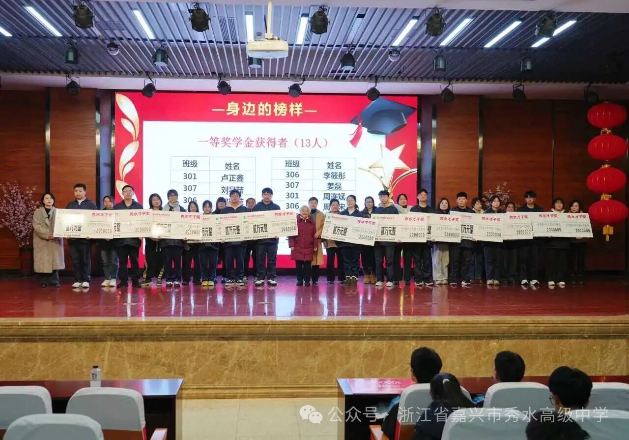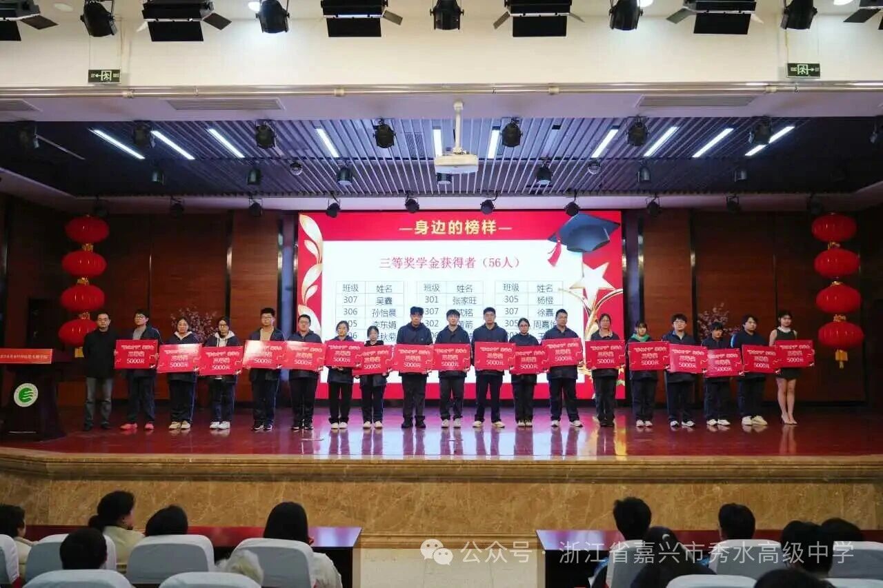 星光不負(fù)趕路人,碩果回饋奮斗者。綜合首考與期末聯(lián)考成績,高三年級(jí)共有123名“秀水才子”脫穎而出,共同斬獲總額1055000元獎(jiǎng)學(xué)金。激昂樂曲聲中,“秀水才子獎(jiǎng)” 獲獎(jiǎng)學(xué)子依次登臺(tái),從校領(lǐng)導(dǎo)手中接過這份沉甸甸的榮譽(yù)。表彰現(xiàn)場(chǎng)掌聲雷動(dòng),既是對(duì)學(xué)子們過往拼搏與優(yōu)異成績的充分肯定,更是對(duì)他們未來征程的美好期許與堅(jiān)定鼓舞。