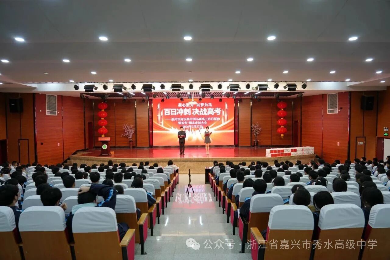 春風(fēng)浩蕩啟新程,百日逐夢(mèng)正當(dāng)時(shí)。當(dāng)高考倒計(jì)時(shí)的指針定格在“100”,出征的戰(zhàn)鼓已然擂響,奮進(jìn)的號(hào)角催人前行。在這莊嚴(yán)而熱烈的時(shí)刻,嘉興市秀水高級(jí)中學(xué)報(bào)告廳內(nèi)莊重肅穆、士氣昂揚(yáng),2026屆高三高考百日誓師大會(huì)暨首考與期末表彰大會(huì)隆重舉行。嘉興市秀水學(xué)院終身名譽(yù)院長、秀水“善愛”教育基金會(huì)理事長陳善,秀水高中校長崔占鴻攜校級(jí)班子,與高三全體師生、家長代表齊聚一堂,以青春之名,立奮進(jìn)之志,赴百日之約,向著高考目標(biāo)全力沖刺。